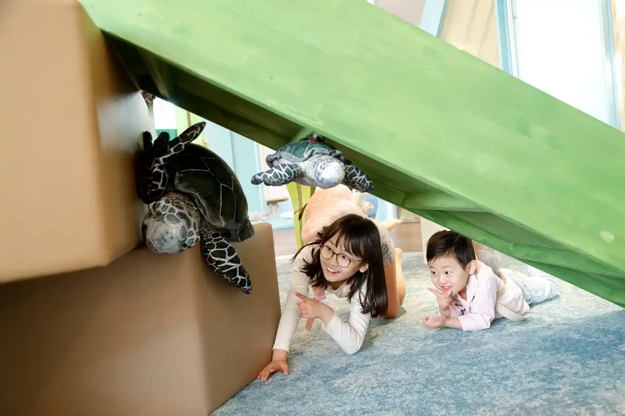 東北最大級の水族館アクアマリンふくしまの子ども体験館「アクアマリンえっぐ」がリニューアル!「きょろきょろかくれんぼ」ゾーンでは生き物になった気分でかくれんぼができるよ |
