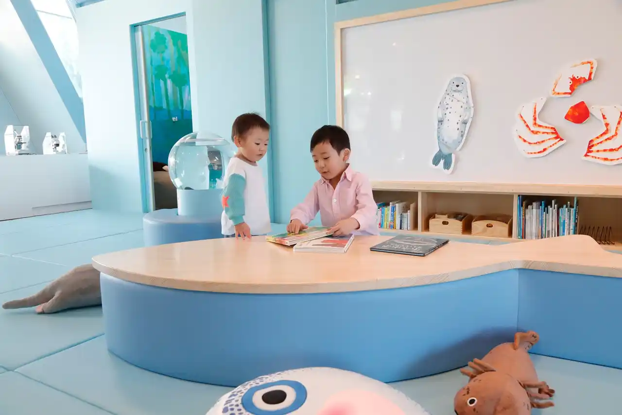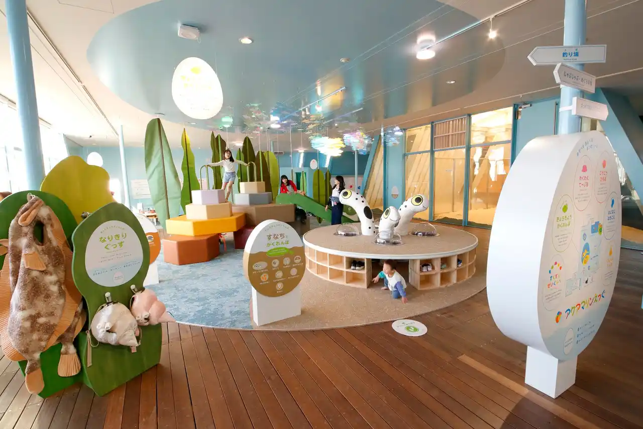 室内のため、天候を気にせずゆったりと過ごせるのが特徴です。自身も母親や父親である飼育員たちが中心となって進めた本プロジェクトでは、水族館ならではの授乳・おむつ替えスペースの設置や、キャプション解説へのひらがな使用、子どもの目線の高さにあわせた展示づくりなど、子育ての気づきから生まれたきめ細やかで赤ちゃんフレンドリーな設計にもこだわりました。 |