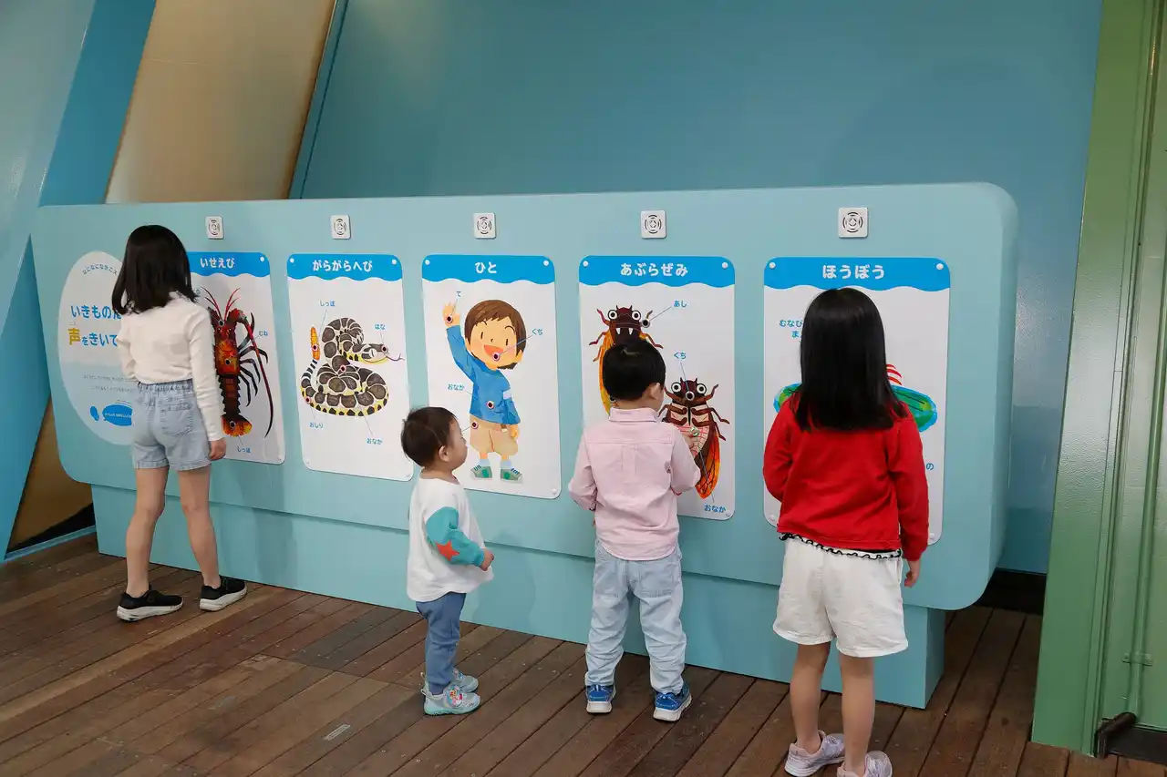 生き物たちは色々な音を出しています。どんな声で、どんな風になくのかな?生き物たちが出す、意外で面白い「音」のひみつを体験できるゾーンです。なかには飼育員たちが集めたアクアマリンふくしまの生き物の音もあります。 |