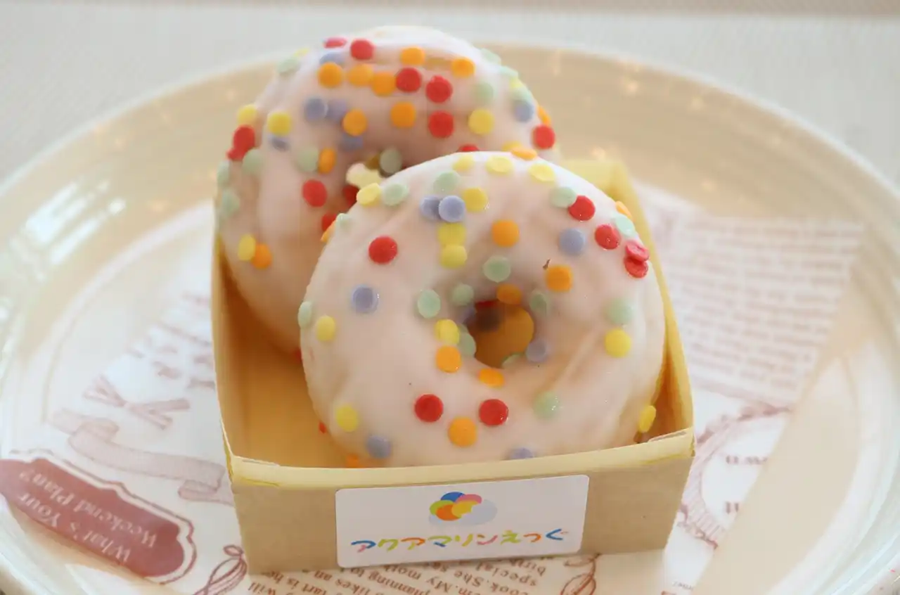 フワフワのミニドーナツの上にアイシングチップがのっています。アクアマリンえっぐのロゴは、五感で楽しむわくわく感を表現しています。そのロゴの色をイメージしたカラフルなドーナツをお楽しみください。 |