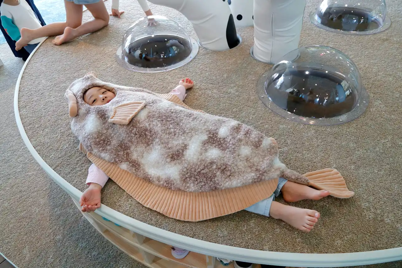 なりきりグッズを使って生き物の気分を味わおう!こちらはひらめぶとん |
