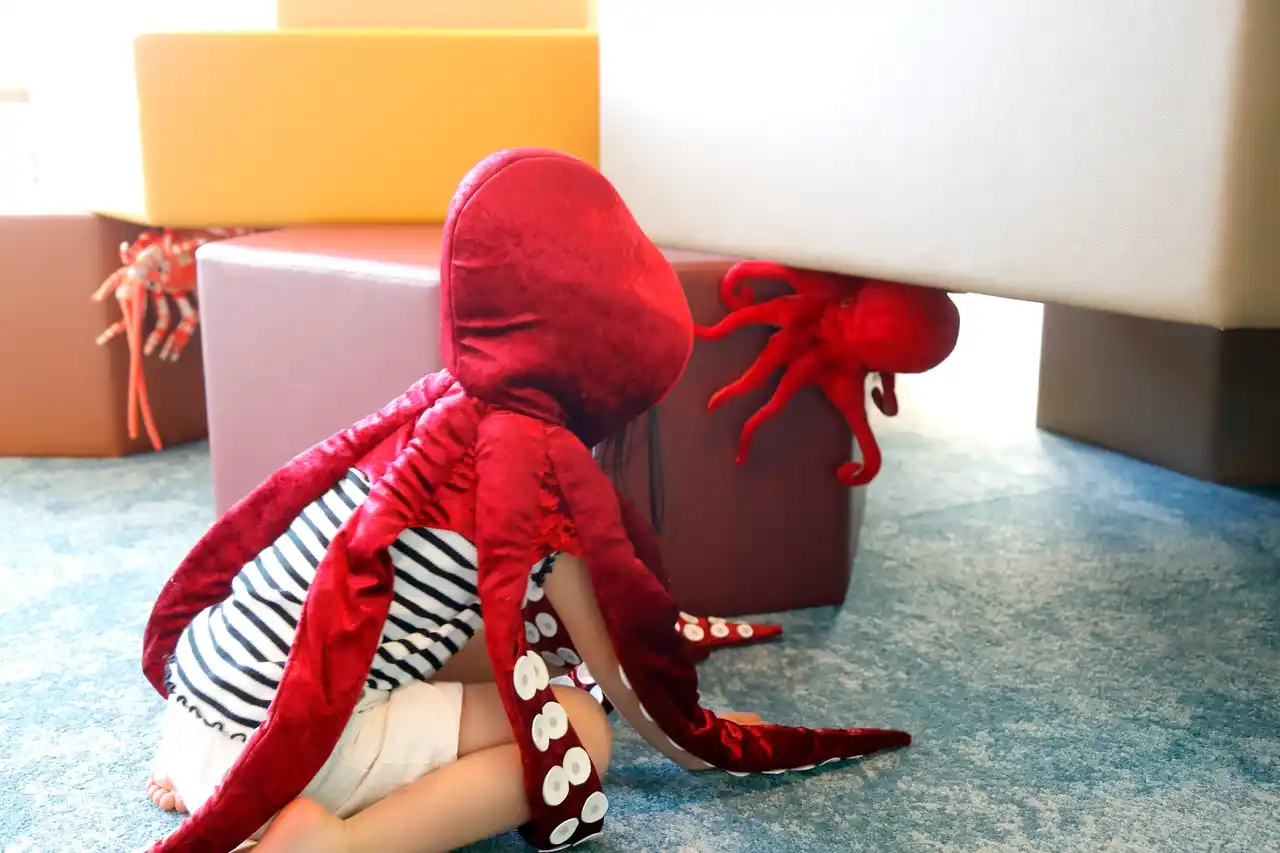 ウミガメやウツボなどのかくれた生き物のイラストやぬいぐるみをさがしたり、タコやヒラメ、ヤドカリのように生き物の気分でかくれてみたり。海の世界で生き物たちの生きるための工夫を体験できるゾーンです。ここでは、なりきりグッズを使って、砂地、岩場、海藻の中でかくれんぼを楽しめます。生き物たちがどんな風にかくれて暮らしているか、体験してみましょう。 |