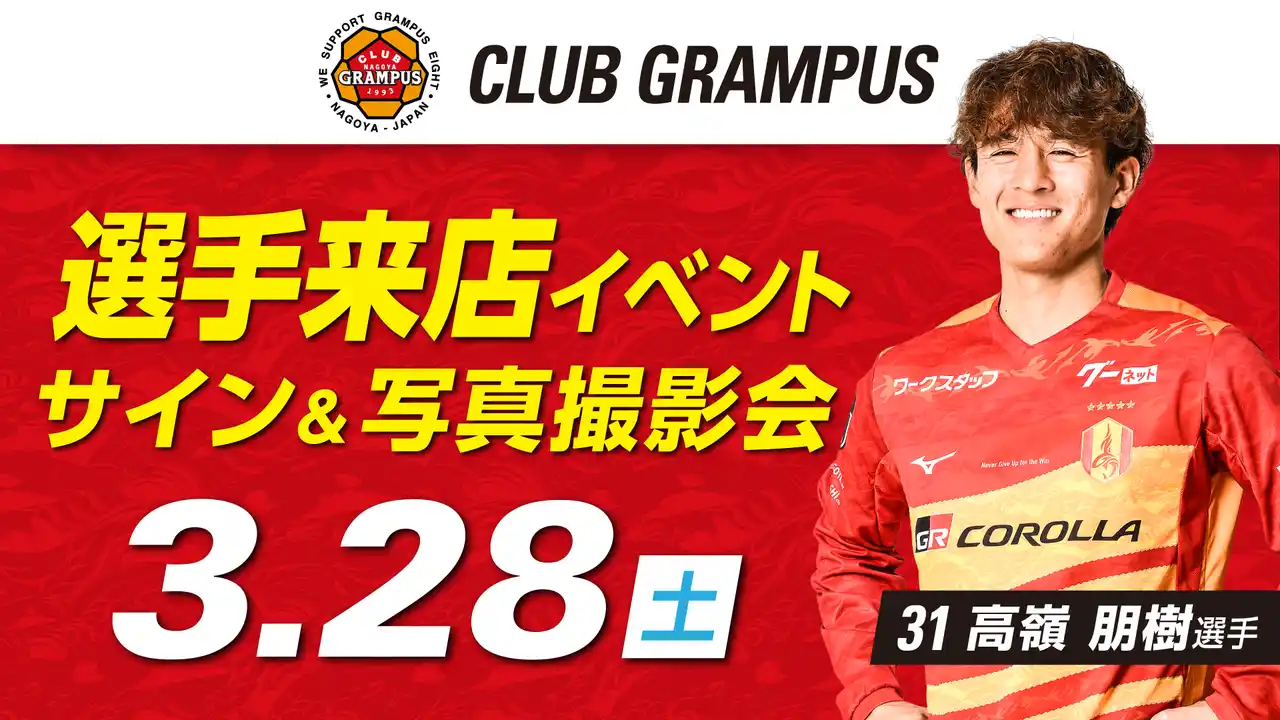 【名古屋グランパス】3/28(土)オフィシャルグッズショップ 「クラブグランパス」 高嶺 朋樹選手来店イベント実施のお知らせ