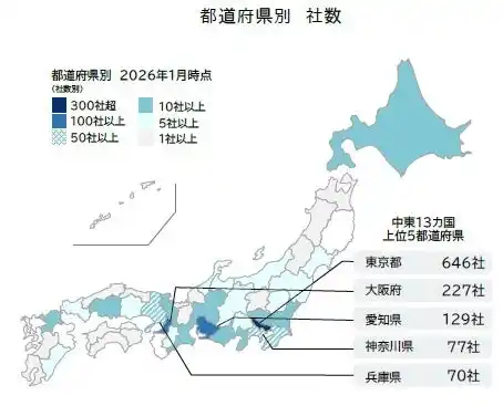 都道府県別(本社所在地に基づく)では「東京都」が最も多い646社だった。「大阪府」(227社)、「愛知県」(129社)が続き、3都府県で全体の6割超を占めた。中東13カ国のいずれかに進出、または輸出入を行う企業は、全国43都道府県で判明した。 |