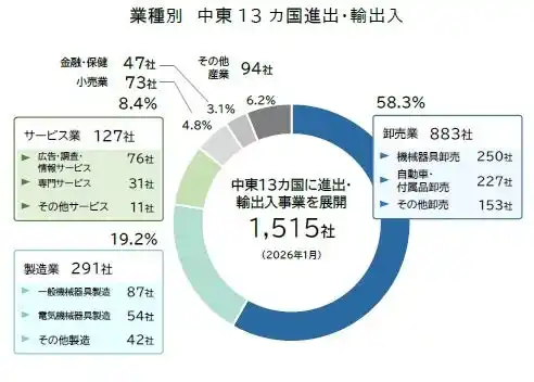 2026年1月時点における、中東13カ国で進出・輸出入などで事業・ビジネスを展開する日本企業は1515社判明した。このうち、企業数は「アラブ首長国連邦(UAE)」が最多の709社、次いで「イスラエル」473社、「サウジアラビア」268社。業種別では卸売業が6割弱(58.3%)、製造業が2割を占めた。都道府県別では、東京・大阪・愛知の3都府県で6割超を占める。 |