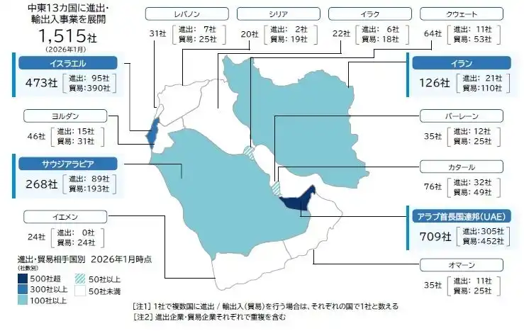 パレスチナを除く中東地域13カ国に進出、または輸出入(貿易)事業(=「中東事業」)を展開する日本企業は、2026年1月時点で少なくとも計1515社が判明した。このうち、駐在拠点や工場など現地に「進出」している企業は469社、輸出入など「貿易」を行う企業は1137社判明した(「進出」「貿易」でそれぞれ重複を含む)。 |