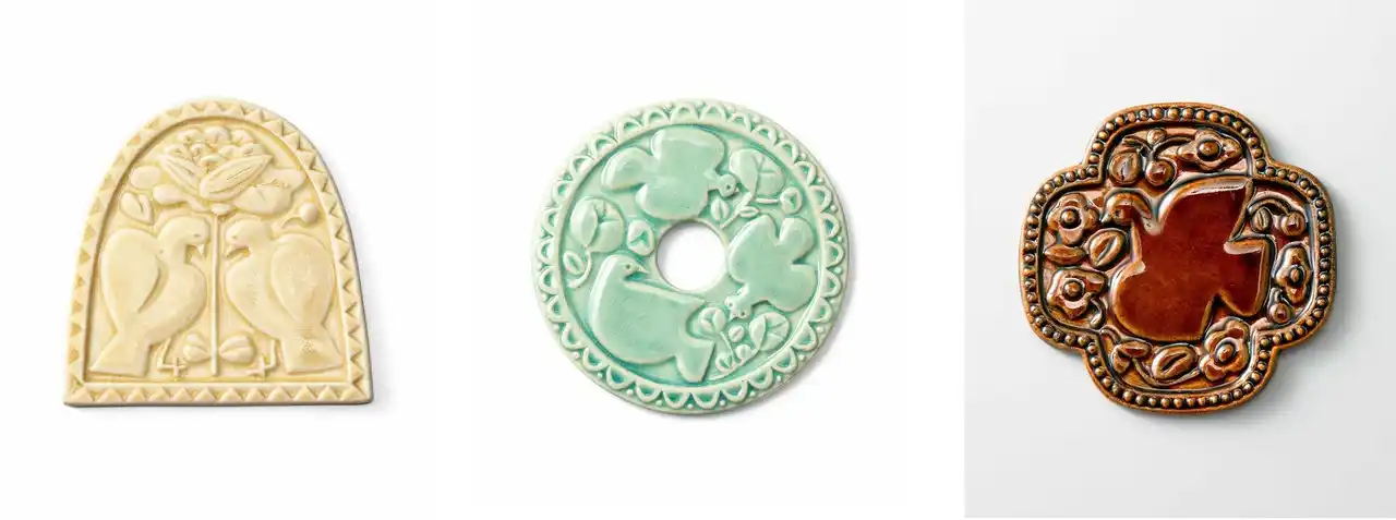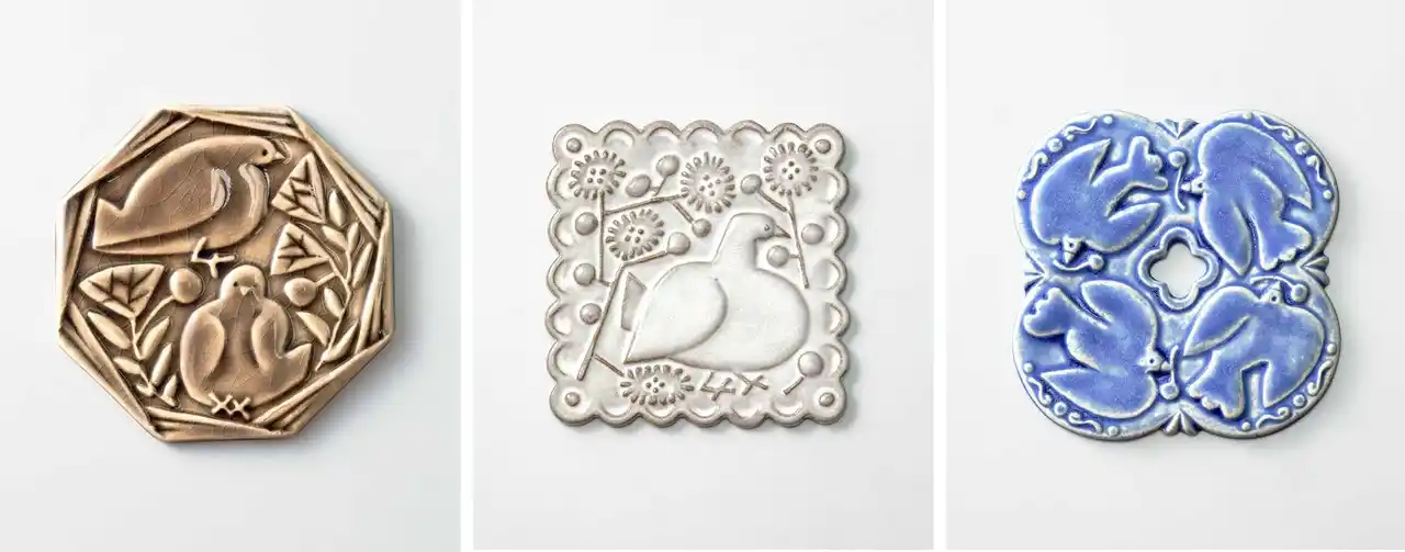 〈OCTAGON:静かに羽を休める鳥たち〉〈SQUARE:花畑に迷い込んだやさしい鳥〉〈ROUND:木の実をついばむ仲のよい鳥の群れ〉〈ARCH:ペアの鳥が仲睦まじく寄り添う風景〉〈CIRCLE:森を飛び交う楽しげな鳥たち〉〈CLOVER:花と一緒に舞う翼を広げた鳥〉。質感の異なる釉薬やデザインのバリエーションも楽しんでください。 |