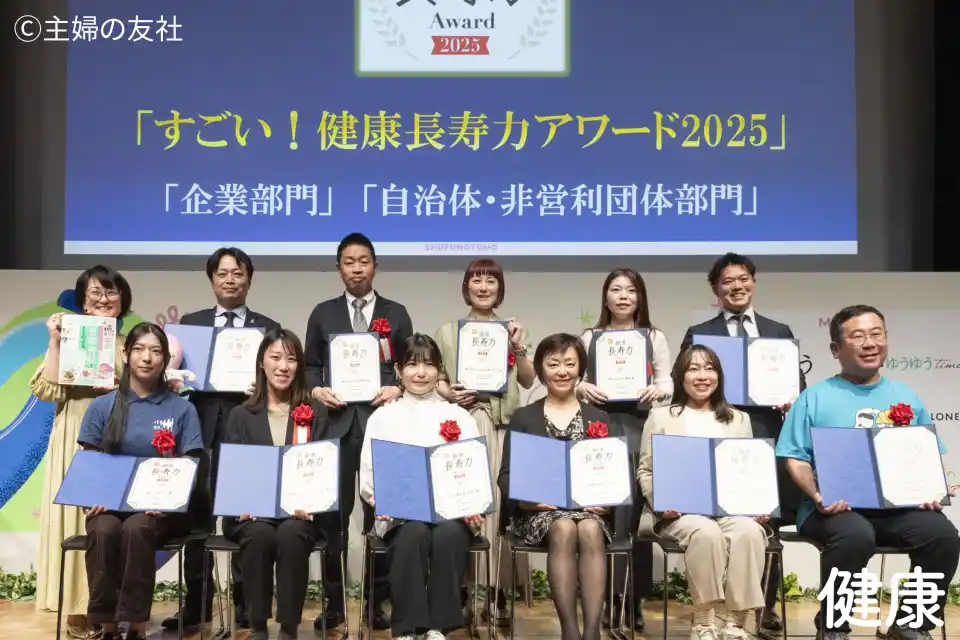 「すごい!健康長寿力アワード」は、株式会社主婦の友社が発行する雑誌『健康』の創刊50周年を記念して、2025年に設立されました。人生100年時代に革新的な挑戦を続けている企業、自治体・非営利団体を表彰する「企業部門」「自治体・非営利団体部門」、健康寿命の延伸に寄与している人を表彰する「ひと部門」の3部門があります。全国各地からのエントリーに対し、読者アンケートおよび投票、医師・専門家の見解をもとに、『健康』編集部が総合的に選考。その結果、今年度は14団体・2名の授賞が決定しました。 |