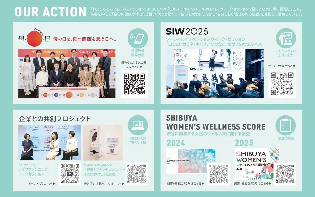 渋谷を中心に「自分の健康や体と向き合い、周りと繋がって自分を大切にしながら“自分らしく”生きられる社会」を目指して「情報発信・啓発活動」「コミュニティの形成・拡大」「調査の実施」「課題解決に向けた活動」を実施しています。 |