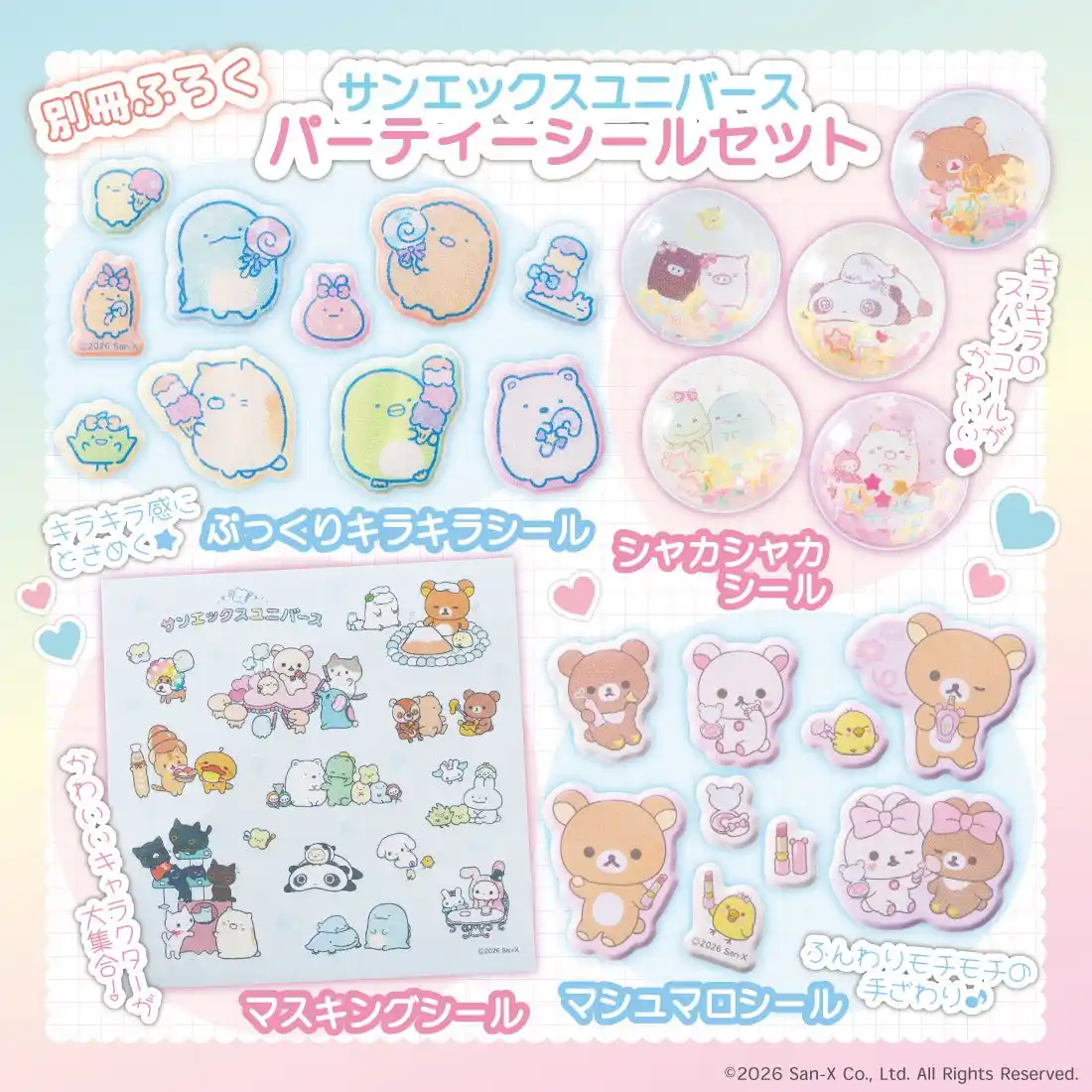 3月13日発売の『キラピチ4月号』の別冊ふろくは、すみっコぐらし、リラックマ、たれぱんだ、こげぱん、まめゴマ、にゃんにゃんにゃんこなどのサンエックスキャラクターが大集合した「サンエックスユニバース パーティーシールセット」。 |