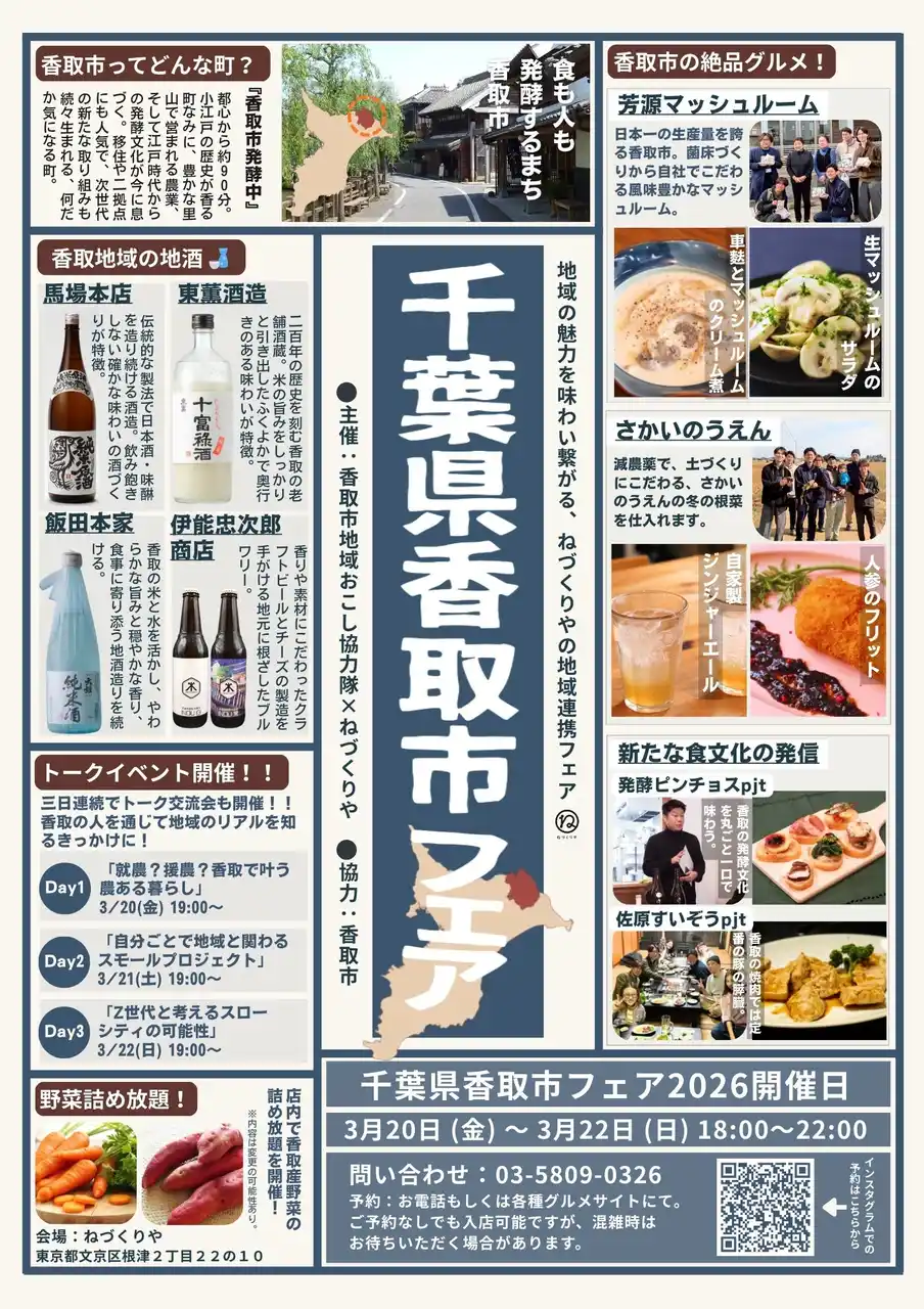 香取市地域おこし協力隊の関係人口創出チームが中心となり、香取市の食や発酵文化、地域の魅力を都内で体感できる「千葉県香取市フェア」を、東京都文京区根津の飲食店「ねづくりや」で開催します。香取市産の食材を活かした料理や香取地域の地酒などを楽しめるほか、香取市民にもご協力いただき、香取の人や暮らし、地域との関わり方をテーマにしたトークイベントを3日連続で実施します。香取市の魅力を“食”を通じて知っていただける機会ですので、ぜひご来店ください。 |