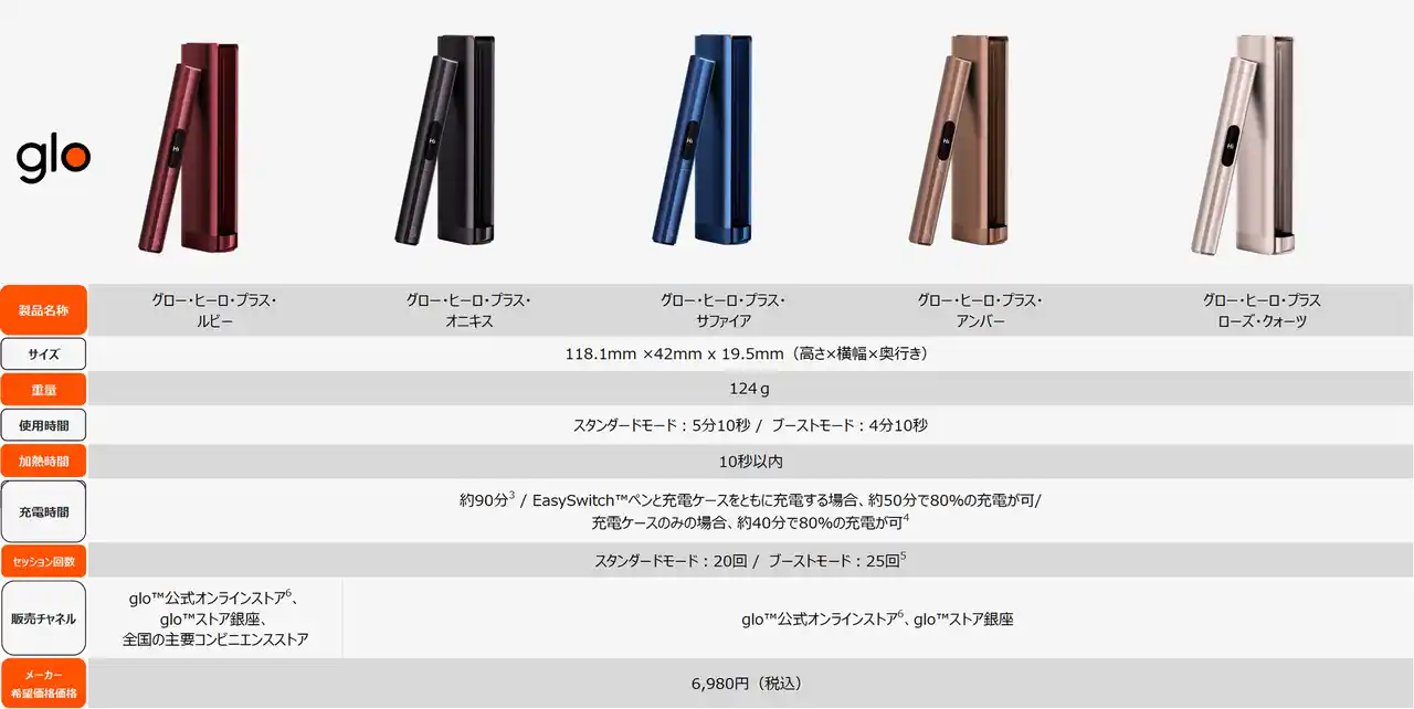 ※1 glo(TM) & VELO オフィシャルオンラインショップ:https://www.shopglovelo.jp/ ※2 本キャンペーンと同じまたは類似する他のデバイス割引キャンペーンが、今後任意の時期に実施される場合があります。一部のお客様に特定の小売店舗等にて提供されるクーポンや値引きが適用される場合を除く。 ※3 製造直後のデバイスを対象にした自社テストに基づく。充電残量のない状態からフル充電されるまでの所要時間を指し、所要時間はバッテリーの使用年月や温度環境によって変動する可能性があります。 ※4 製造直後のデバイスを対象にした自社テストに基づく。充電残量のない状態から80%の充電量に至るまでの所要時間を指し、所要時間はバッテリーの使用年月や温度環境によって変動する可能性があります。 ※5 セッション回数は、フル充電されたデバイスもしくはglo(TM) Hilo Plus充電ケースの自社テストに基づいており、個人の使用状況により異なる場合があります。 ※6 公式オンラインストアはこちら: ・glo(TM) & VELO オフィシャルオンラインショップ:https://www.shopglovelo.jp/ ・公式 glo(TM) Yahoo!店:https://shopping.geocities.jp/glo/ ・公式glo(TM) 楽天市場店:https://www.rakuten.ne.jp/gold/glo-online/ ・Amazon でもご購入いただけます。 ※7 グロー・ヒーロ・ローズ・クォーツは、期間・数量限定製品のため、店舗によってはすでに販売を終了している場合があります。 |