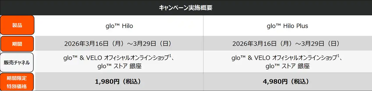ブリティッシュ・アメリカン・タバコ・ジャパン合同会社(本社:東京都港区、代表:マウリシオ・ララ、以下「BATジャパン」)は、革新的な加熱技術TurboStart(TM)テクノロジーを搭載した加熱式たばこデバイス「glo(TM) Hilo(グロー・ヒーロ)」および「glo(TM) Hilo Plus(グロー・ヒーロ・プラス)」を、2026年3月16日から3月29日までの期間限定で特別価格(※2)にて販売します。 本キャンペーンでは、両デバイスの全カラーを対象にメーカー希望小売価格から2,000円オフで提供し、「glo(TM) Hilo」は1,980円、「glo(TM) Hilo Plus」は4,980円となります。対象販売チャネルはglo(TM)ストア銀座およびglo(TM) & VELO オフィシャルオンラインショップ(※1)で、これらのチャネルで「glo(TM) Hilo(グロー・ヒーロ)」および「glo(TM) Hilo Plus(グロー・ヒーロ・プラス)」が割引価格で販売されるのは今回が初となります。 ■ 「glo(TM) Hilo(グロー・ヒーロ)シリーズ」について 「glo(TM) Hilo」シリーズは、先進のテクノロジーと洗練された機能美を融合させた加熱式たばこデバイスです。新加熱技術「TurboStart(TM)テクノロジー」により、「glo(TM) Hilo」ではわずか5秒、「glo(TM) Hilo Plus」では10秒以内でパンチがありなめらかな吸いごたえを実現しました。また、デバイス側面に搭載されたスクリーンにより、セッション状況やバッテリー残量など、デバイスの状態を直感的に把握できます。 ■ キャンペーン概要 |