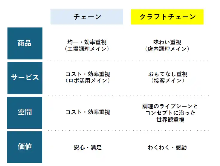・効率を重視する一般的なチェーン店は、工場調理(セントラルキッチン)をメインとするのに対し、クラフトレストランは店内で調理することを重視しています。 |