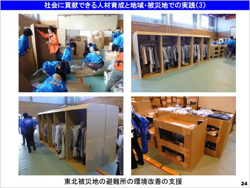 建築学部の学生がその場で段ボールを切って組み立てて机や仕切りを作成し避難所の環境を改善 |