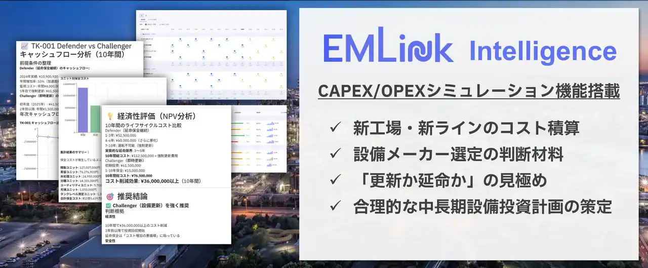 株式会社設備保全総合研究所(本社:東京都目黒区、代表取締役CEO:相原章吾、以下EML)は、工場・インフラ向けアセットマネジメントシステム「EMLink」のAI活用機能群「EMLink Intelligence」に、新たに「CAPEX/OPEXシミュレーション機能」を搭載したことを発表いたします。 |