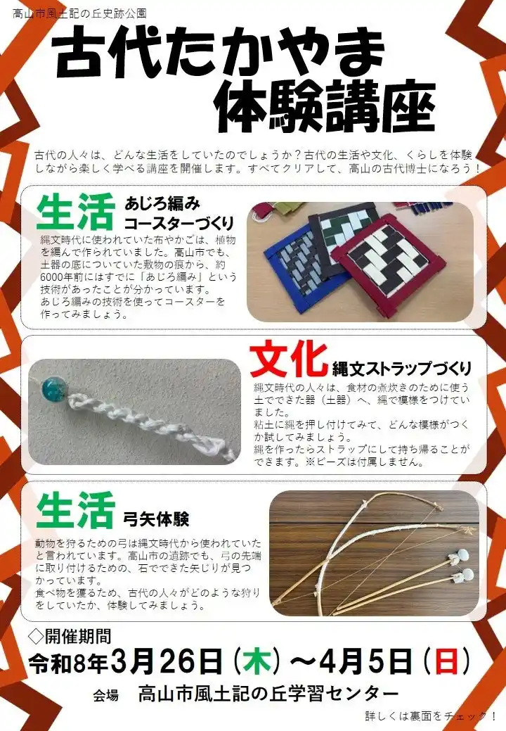 古代の人々は、どんな生活をしていたのでしょうか?古代の生活や文化、くらしを体験しながら楽しく学べる講座を開催します。すべての体験をクリアして、たかやまの古代博士を目指しましょう! |