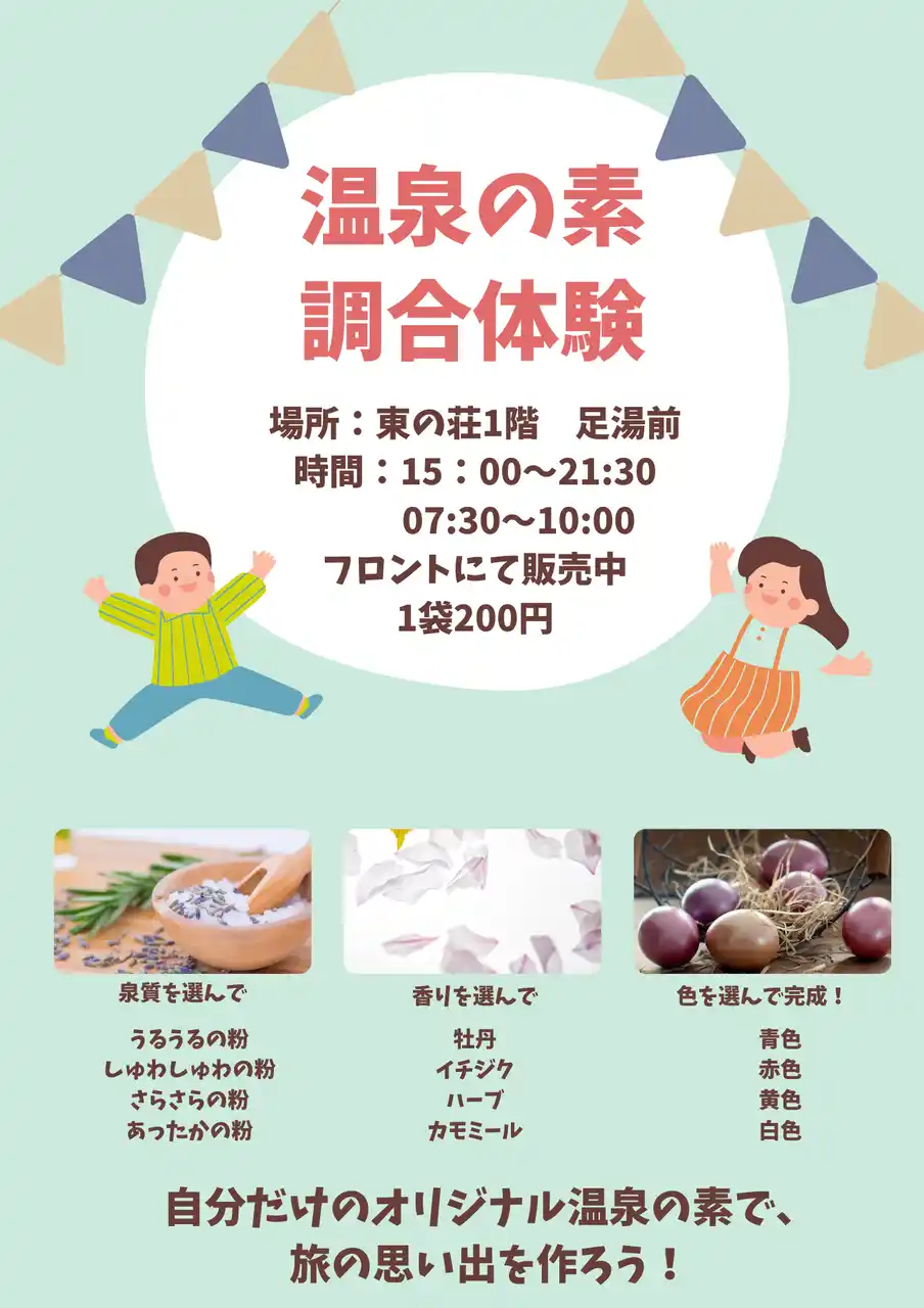 4種類の泉質、香り、色を自由に組み合わせて、オリジナルの入浴剤を作成できる体験コーナーを設置。滞在中のリラックスタイムにはもちろん、ご友人へのギフトや、ご自宅での「追い温泉」としても最適です。 |