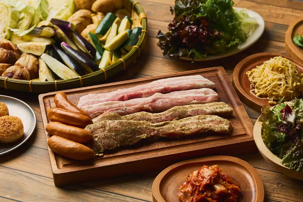 豚バラ肉をプレーンとハーブの2種で楽しむ韓国スタイルのBBQ。焼きおにぎり、枝豆に加え、キムチやナムルもやしなど、箸が止まらない副菜も充実。サラダと焼き野菜は食べ放題。気軽にルーフトップBBQを楽しみたい方におすすめの入門コースです。 |