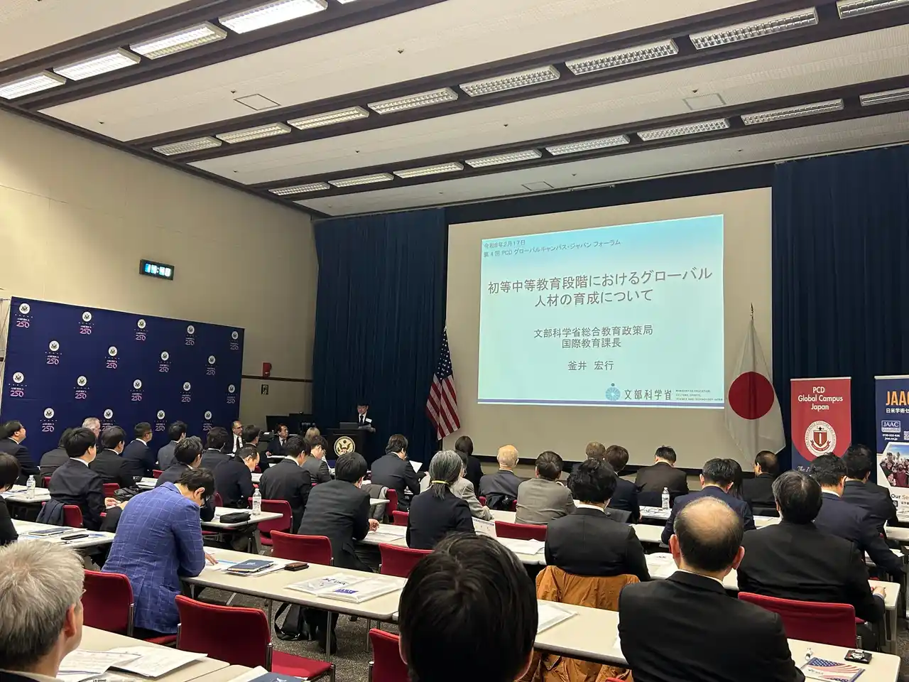 | フォーラムは、米国側から在日米国大使館 二等書記官 Eric Podzorski氏による開会の挨拶、続いて日本側から文部科学省 国際教育課長の釜井宏行氏が登壇し、基調講演を行った。日米両国は安全保障や経済協力のみならず、次世代の国際教育分野においても、さらなる連携強化が不可欠であるとの共通認識を示した。その上で、両国における最新の教育政策や留学生支援に関する具体的な施策が紹介された。さらに、DDPを合同運営する3つの教育機関(PCD、HGS、JAAC)からは、最先端の教育内容や今後のグローバル戦略、国内の中高教育への提言などが共有され、参加した学校長や教員が熱心にメモを取る様子が見られたほか、レセプションでは活発な情報交換が行われた。 | |||||||||||||||||||