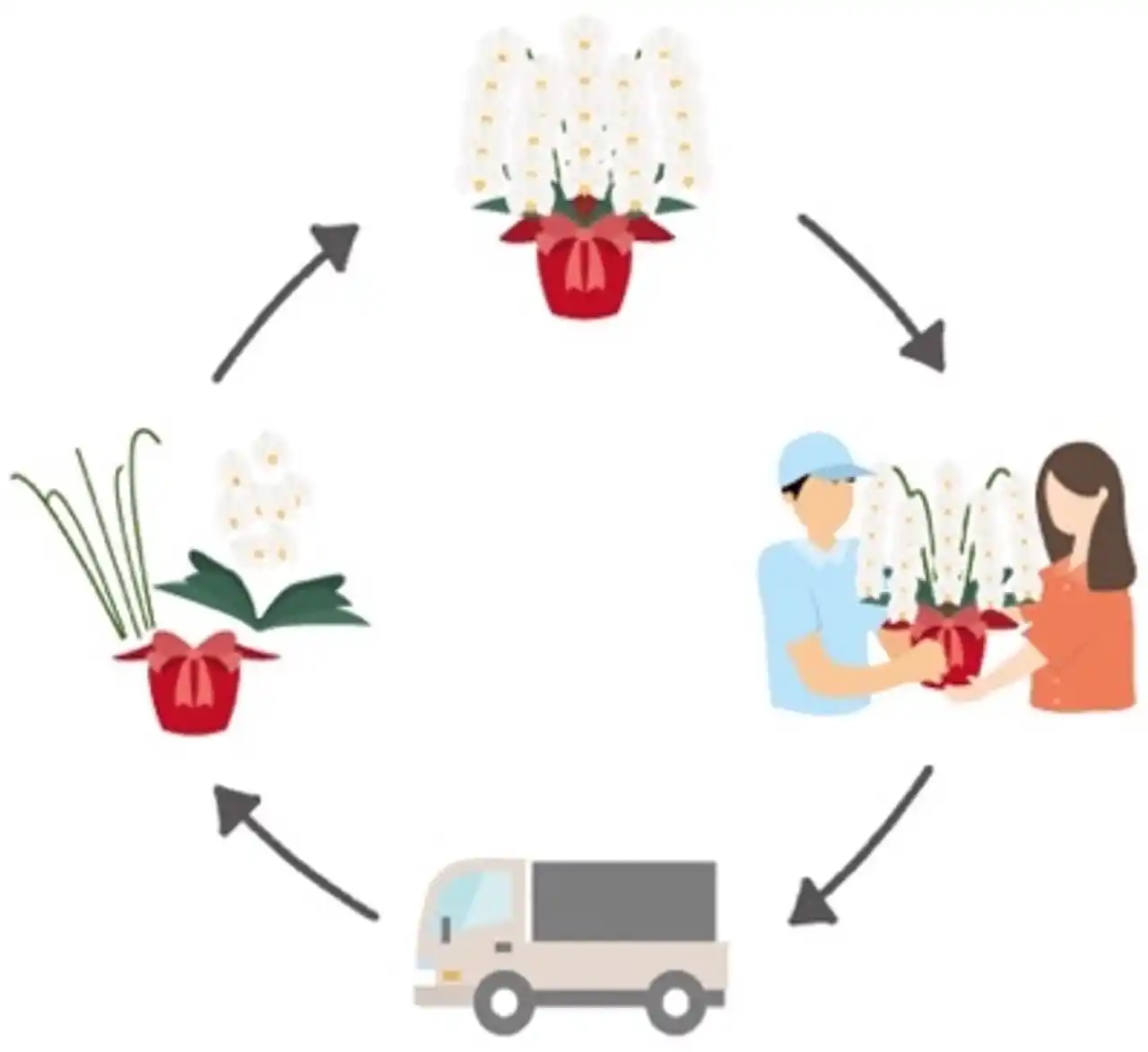 | LIVENTが発売する全ての胡蝶蘭商品に「無料回収券」をつけ、LIVENT配送エリアに送料無料でお届けし、鑑賞後不要になった際、無料で回収依頼ができるサービスです。回収された胡蝶蘭は、専門業者によって丁寧に分別・再利用され、循環していきます。 | |||