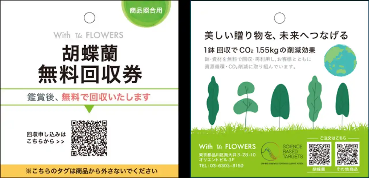 | 胡蝶蘭に無料回収券を付けてお届けするため、受け手には廃棄の手間や費用がかかりません。贈る側も相手に配慮した贈り物ができます。胡蝶蘭を鑑賞し終えたら、無料券にあるQRコードから回収依頼を行い、専門業者が回収します(回収券が必須)。回収期限はなく、回収された胡蝶蘭や資材は次のサービスや鉢へと循環します。 | |||