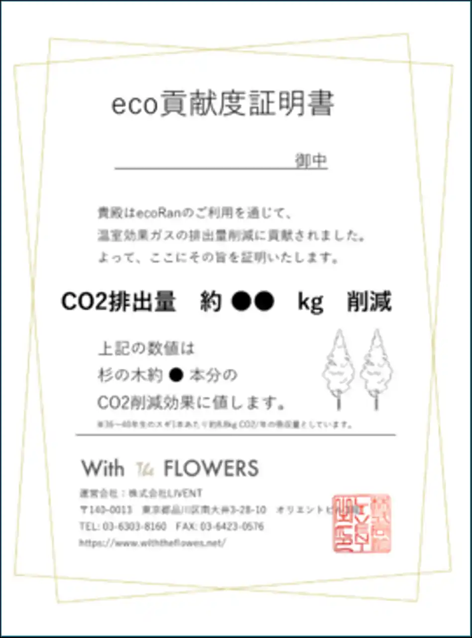 | ecoRanをご利用いただいた贈り主様には、LIVENTが独自で発行する「eco貢献度証明書」をお送りします。ecoRan一鉢のご注文をCO2排出量に換算することで環境負荷を実感いただけ、企業のESGレポートやCSR活動の一環としてもご活用いただけます。一鉢回収で削減できる1.55kgのCO2排出量数値をよりわかりやすく、スギの木何本分の吸収量(※3)に相当するかに換算し数値化することで、環境意識を高めることができます。 | |||