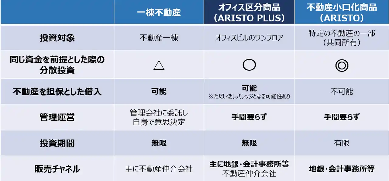 オフィス区分商品「ARISTO PLUS」は、都心の中小型オフィスビルを敷地利用権付の区分建物として独立した所有権に分割し、ワンフロア単位で販売する不動産投資商品です。 |