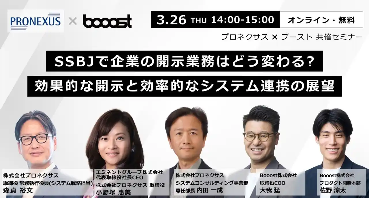 大手企業でのシェアNo.1*の「サステナビリティERP1」提供と、「サステナビリティ2026問題*2」の提唱を通じて企業のSX(サステナビリティ・トランスフォーメーション)*3 を支援するBooost株式会社(東京都品川区、代表取締役:青井宏憲、以下 当社)は、株式会社プロネクサス(本社:東京都港区、代表取締役社長 上野 剛史)と共催で、2026年3月26日(木)14:00~15:00 にオンラインセミナー「SSBJで企業の開示業務はどう変わる?効果的な開示と効率的なシステム連携の展望」 を開催いたします。