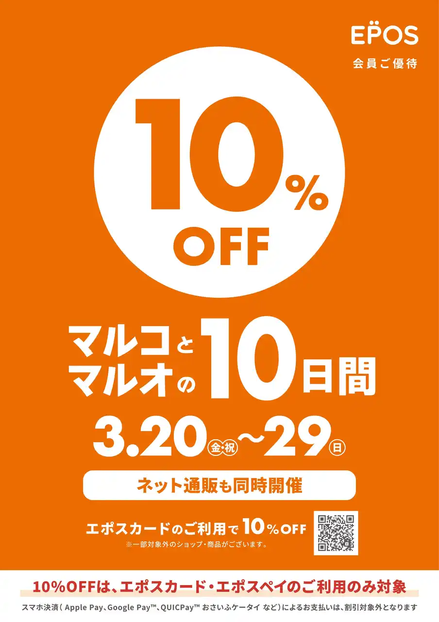 株式会社丸井(本社:東京都 中野区、代表取締役社長:青野 真博)は、2026年3月20日(金・祝)~3月29日(日)の10日間、マルイ・モディ全店およびマルイのネット通販「マルイウェブチャネル」にて、エポスカード会員ご優待キャンペーン『マルコとマルオの10日間』を開催いたします。期間中、エポスカードのクレジットでのお支払いで、10%OFFにてお買物いただけます。 |