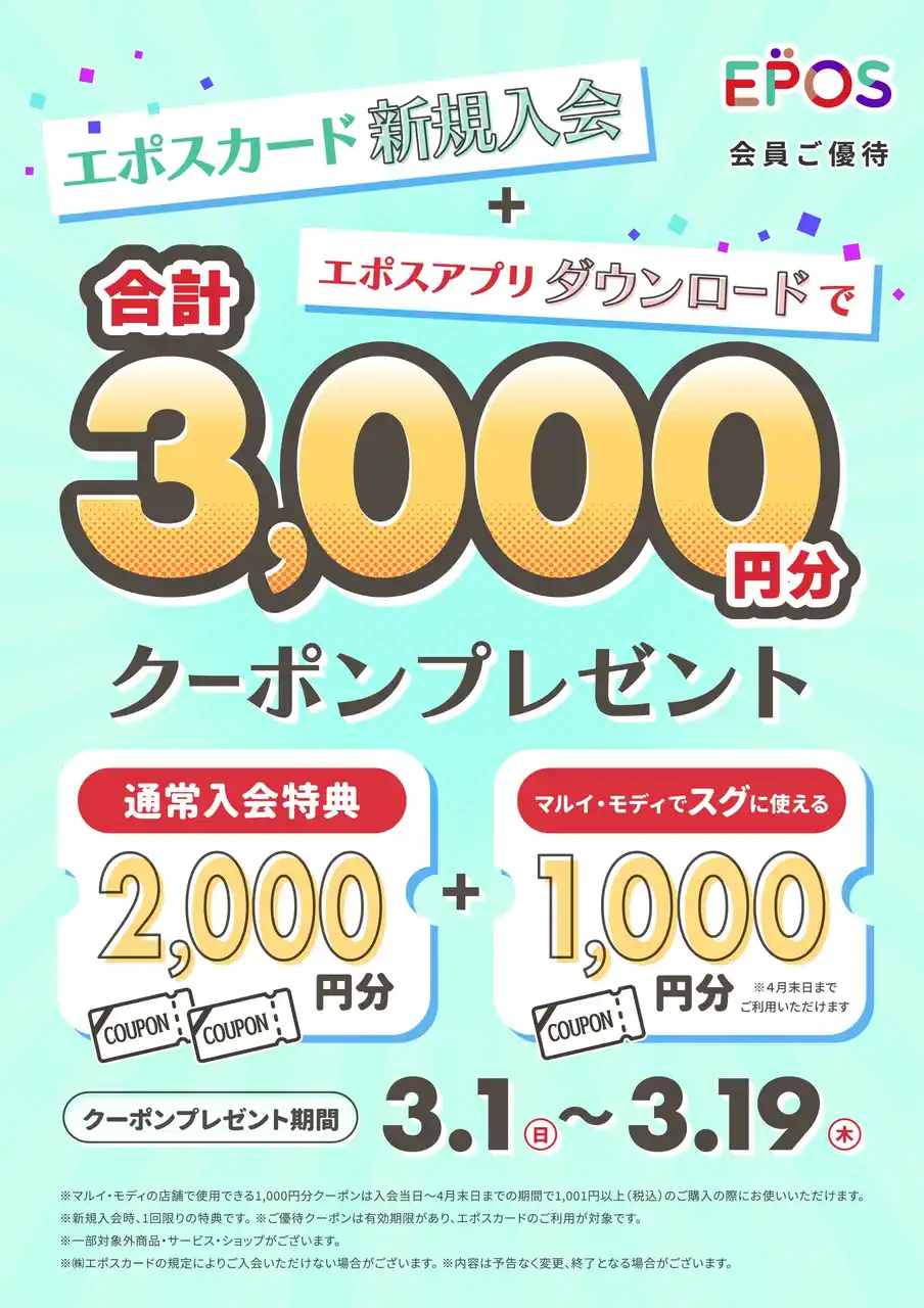 さらに、3月19日(木)までに「エポスカードに新規でご入会」&「エポスアプリをダウンロード」いただいたお客さまには、通常入会特典の2,000円分クーポンに加え、さらに1,000円分のクーポンをプレゼント! |