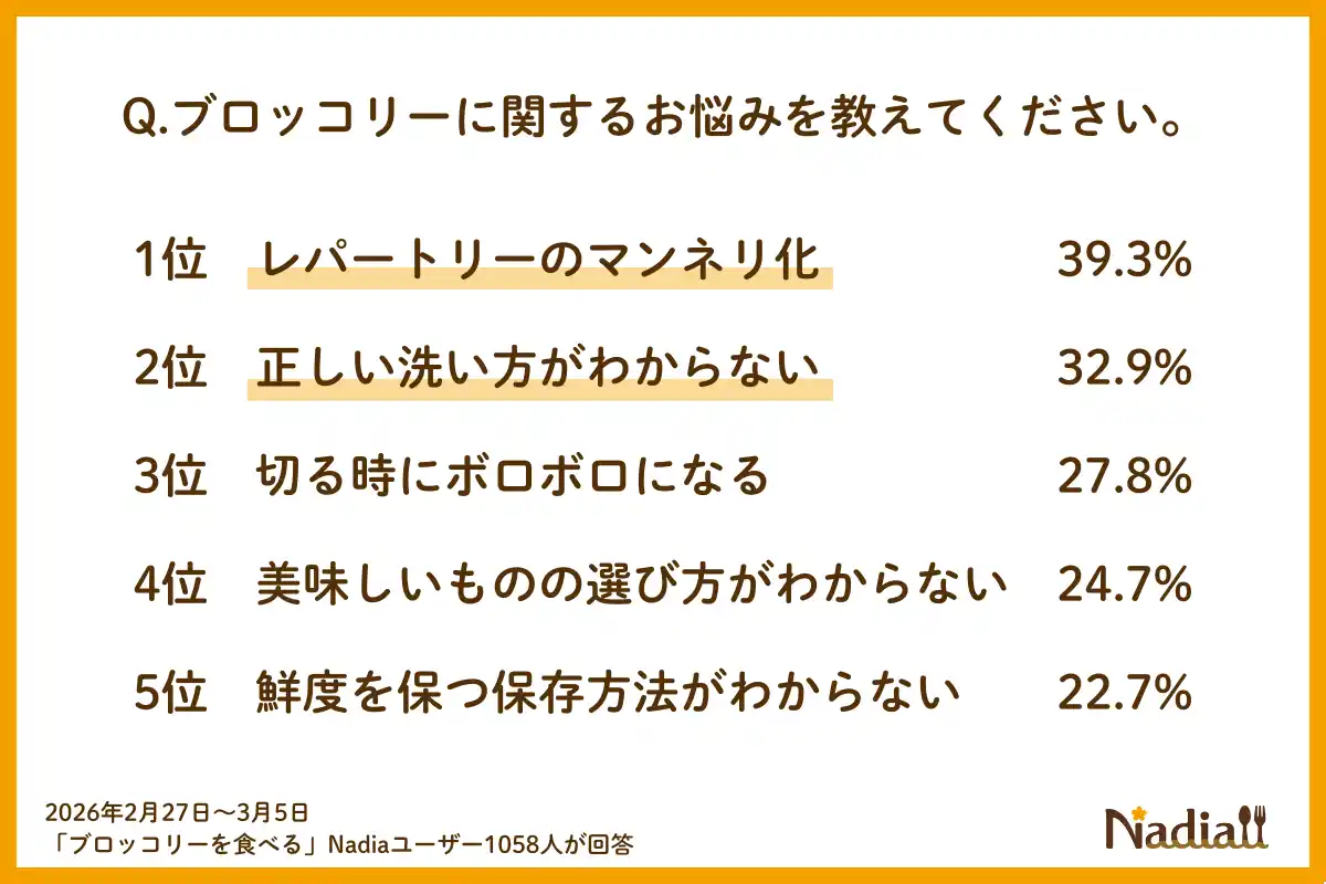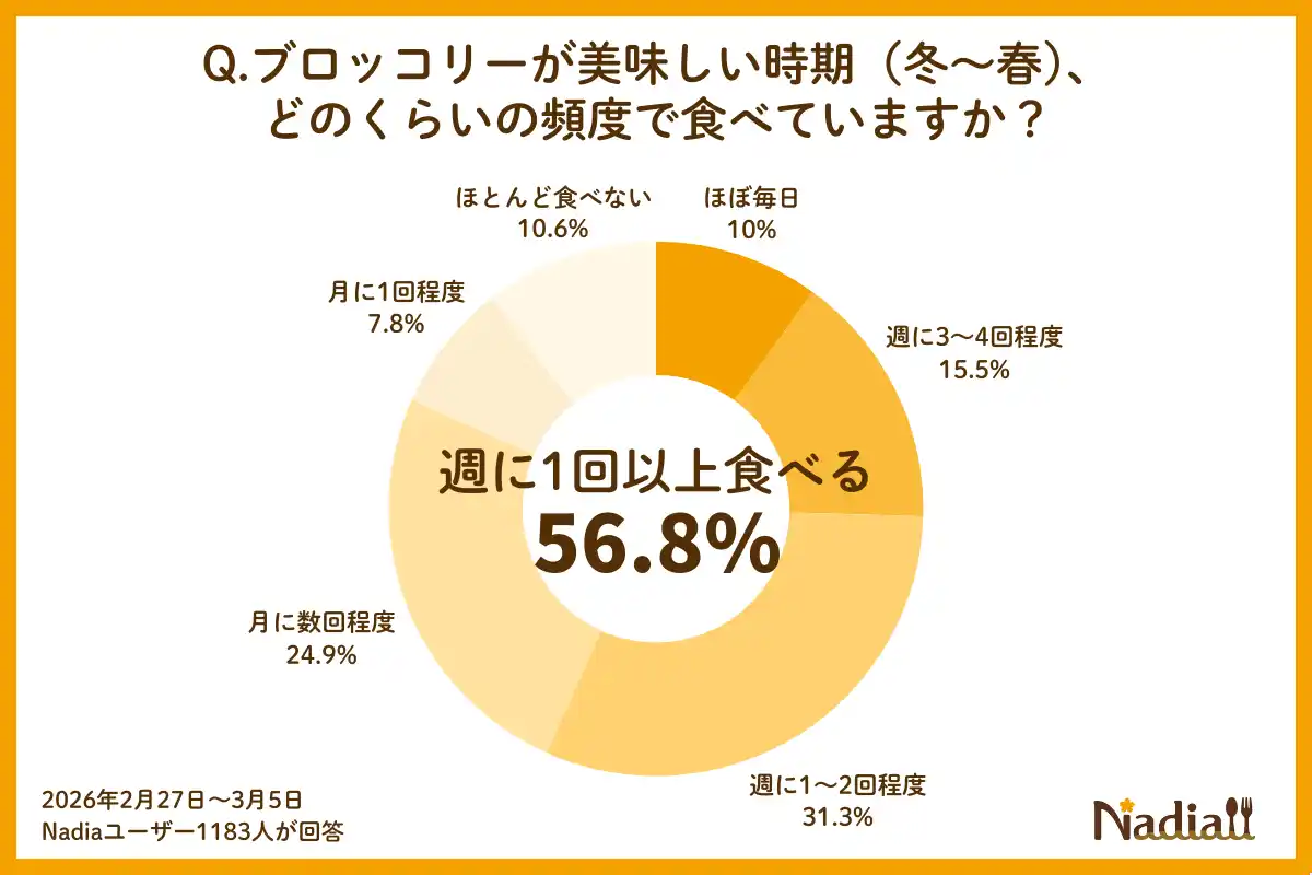 Nadia株式会社(東京都港区/代表取締役社長 葛城嘉紀)にて運営している料理メディア「Nadia(ナディア)」(URL:https://oceans-nadia.com/)は、2026年4月から「指定野菜」追加されるブロッコリーに関する意識調査(※)を行いました。 |