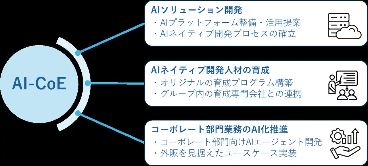 AI関連ビジネスの拡大、人材の育成、業務改革の加速を図るため、コーポレート部門のイノベーション推進部を、事業部門のAI専門組織として再編し、よりビジネスと直結した取組みとして強化します。名称は、「AI-CoE(AI Center of Excellence)」に変更します。AI-CoEはAI推進の中核組織として、各組織およびグループ会社と連携しながら、AIソリューション開発、AIネイティブ開発人材の育成、コーポレート部門業務のAI化推進など、当社のAI活用の高度化と加速を主導します。 |