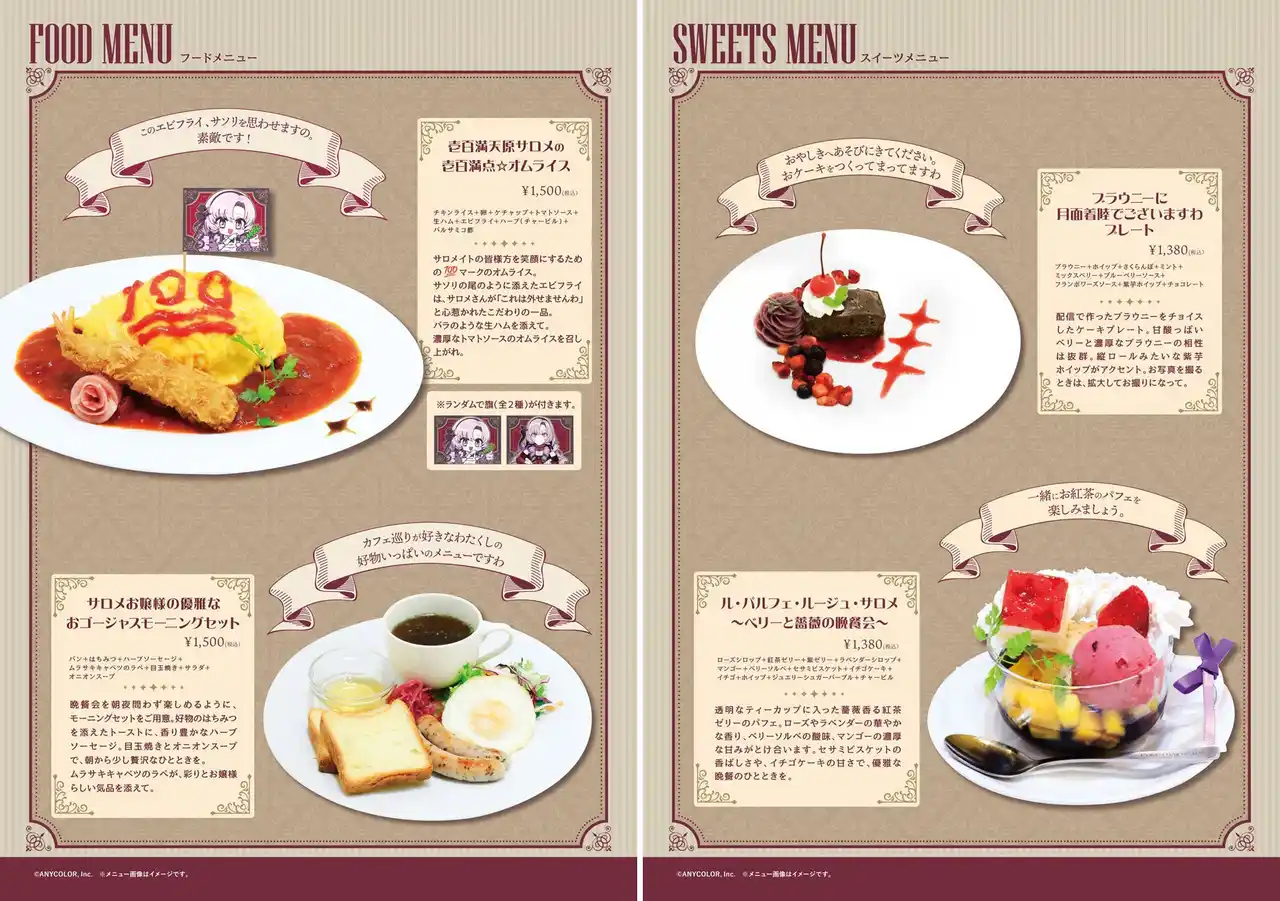 2001年創業、キュアメイドカフェの25周年記念企画としてにじさんじ所属VTuberの「壱百満天原サロメ」とのコラボカフェ開催が決定いたしました。 コラボカフェには、紳士淑女の皆様方にむけて、サロメさんご本人に監修いただいたコラボメニューがラインナップ。コラボメニューをご注文で【限定特典】をプレゼントいたします。 |