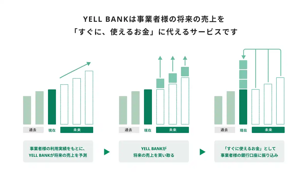 | 「YELL BANK」は、プラットフォームサービスを利用する事業者様が、リスクを負うことなく即時に資金調達できる、プラットフォーム連携型の金融サービスです。「YELL BANK」は、プラットフォームサービスを利用する事業者様の利用実績データをもとにAIが将来債権を自動評価いたします。評価した将来債権を「YELL BANK」が買い取ることで、事業者様は将来の売上を“今すぐ”事業に活用することができます。 | |||||||||