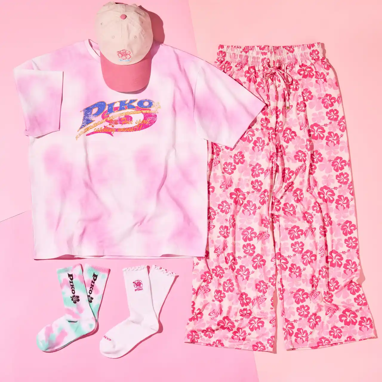 今回のコレクションのテーマカラーはピンク!大きなフロントロゴが目を引くタイダイTシャツや、ハワイっぽさたっぷりの派手柄イージーパンツなど、エネルギッシュな主役級アイテムがそろいます。さらに、ハイビスカスとロゴ刺繍をワンポイントで施した、バイカラーのキャップや、足元からリゾート気分を盛り上げるソックスまで、バリエーション豊かなピンクのラインアップが勢ぞろい。ひとつ取り入れるだけで、一気に旬の“平成かわいい”スタイルを叶えてくれる、PLAZA限定の特別なコレクションです。 |