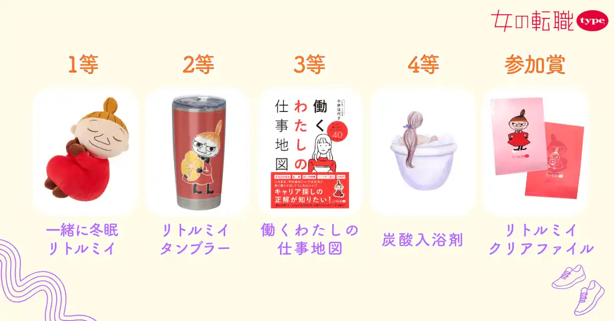 『女の転職type』公式SNSをフォローしてくださった方全員に、ハズレなしのガラポン抽選会を実施します。リトルミイの可愛いグッズや、マラソン後にうれしい癒しグッズなど、素敵な景品を揃えてお待ちしています。 |