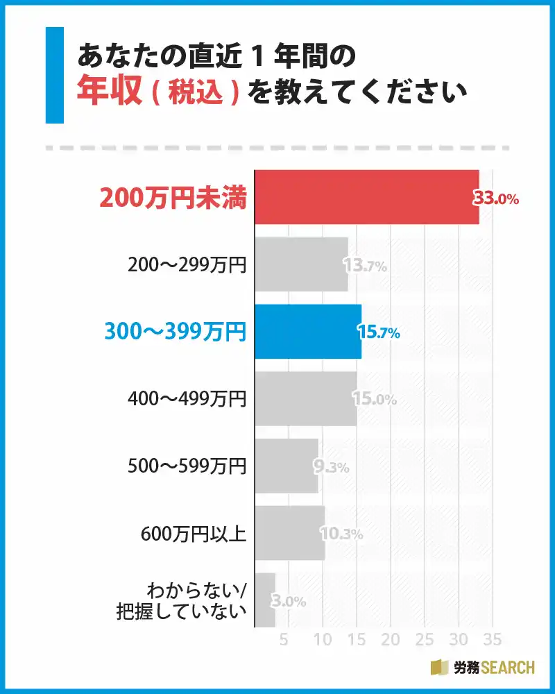 | ● 年収200万円未満が最多、300~500万円未満に集中する年収分布 | ||||||||||||||