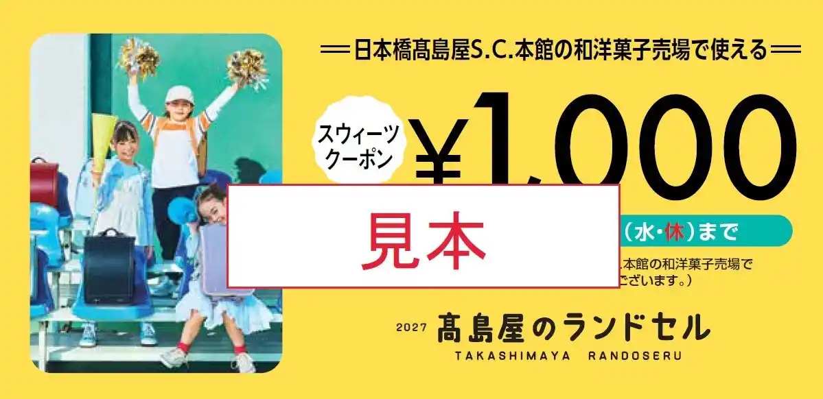 ランドセル売場でお買上げいただいたお客様に、食料品フロア(スイーツ限定)でご利用いただけるクーポンをプレゼントいたします。 |
