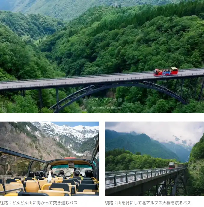 運行期間は、奥飛騨の美しい新緑が最盛期を迎える5月から6月の3週間に設定しました。標高が上がるにつれて、新緑から雪解け水が流れる残雪へと景色が劇的に変化する、この時期ならではのドラマチックな絶景が楽しめます。バスガイドによる奥飛騨温泉郷の歴史や植生に関するガイド解説を聞きながら、新緑の輝きと残雪のコントラストを堪能し、自然の息吹を感じることで感動を深めることができます。 |