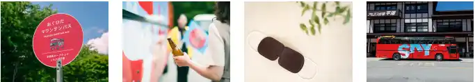 往路は「新緑レター便」と名付け、新緑を目いっぱい楽しむ内容です。乗客全員に配られる、「新緑スーパーグラス」をのぞくと、新緑の色彩がぐっと迫るように見えてきます。山頂では感動を未来に送る「おくひだオリジナルポストカード」へ記念のスタンプを押して投函できます。復路の「癒やしの湯のみち便」では、アイマスクで視覚を遮断し、森の香りや川のせせらぎに集中することで心身をリラックス。オリジナルラベルのサイダーで、喉の渇きを潤し、山のふもとで入る温泉に心馳せます。ただ単にバスに乗って移動するだけでない、新たなバスの楽しみ方「BUSVENTURE(バスベンチャー)」として、ワクワクするひとときを過ごせます。 |