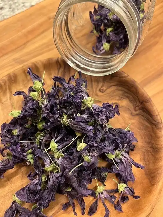 マロウブルーは、和名「ウスベニアオイ」の名でも知られている。ヨーロッパ原産のアオイ科ゼニアオイ属の二年草です。花はハーブティーとして利用されており、お湯を注ぐと透き通った青いお茶になります。そこにレモンを浮かべると美しいピンク色に変わることから「夜明けのハーブ」とも呼ばれています。今回、工藤静香さんのお庭で育てられ、静香さんが一つ一つ手摘みして乾燥させたものをエキスにして美容液(下層)に使用しました。 |