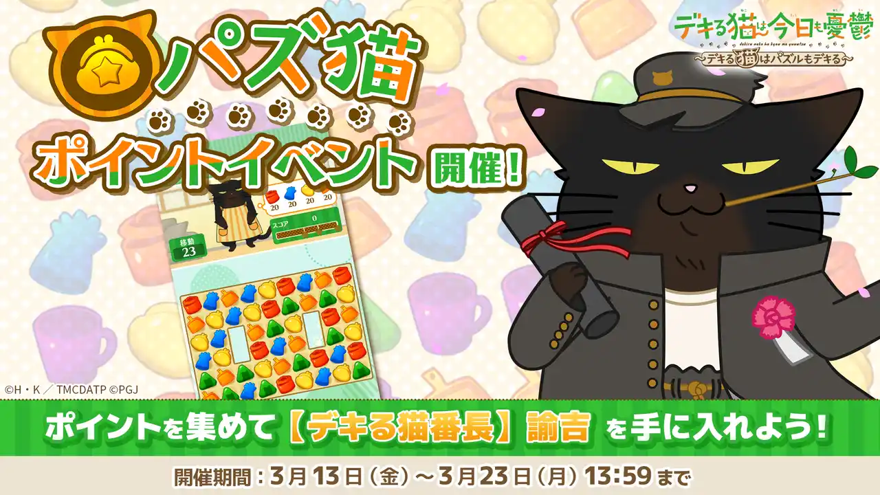ポッピンゲームズジャパン株式会社(本社:東京都港区、代表取締役 CEO:谷口祐一郎)は、TV アニメ「デキる猫は今日も憂鬱」(略称:デキ猫)の新作スマートフォン向けパズルゲーム「デキる猫は今日も憂鬱~デキる猫はパズルもデキる~」(略称:パズ猫)がゲーム内イベントを開催することをお知らせいたします。 |