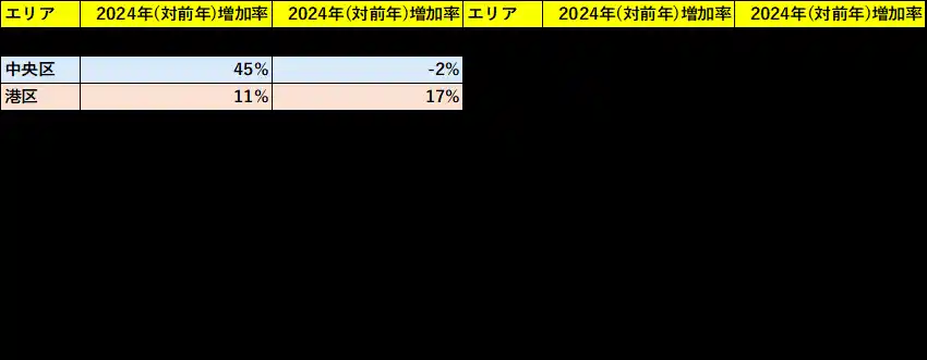 中央区では、2024年の再販マンション増加率が前年比45%と急激な拡大を見せました。これは湾岸エリアの人気上昇とともに、多くの不動産会社が再販ビジネスに参入したことを示しています。 |