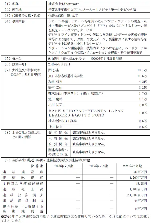 | 当社は、Liberawareが実施する第三者割当による新株式発行により、同社の普通株式310,200株を取得する予定です。本株式取得は、2026年3月31日に実行される予定であり、取得予定価額は500,042,400円です。 | |||||||||