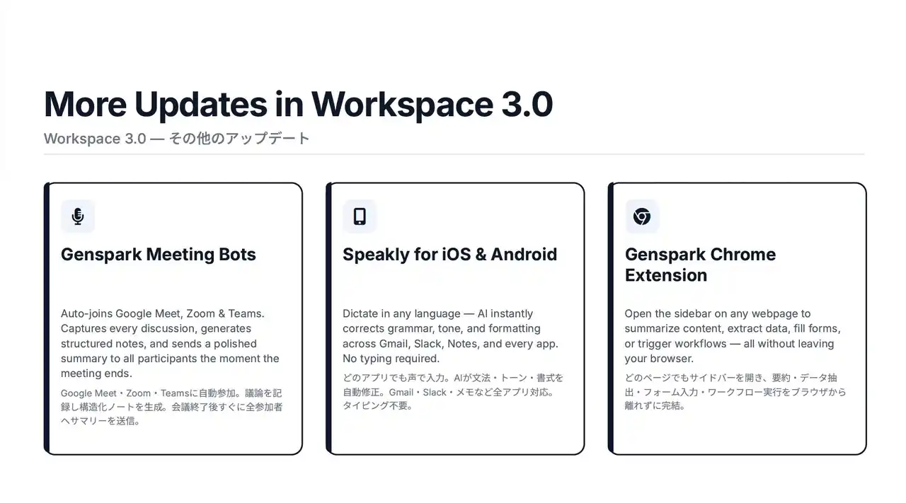 ●Genspark Workflows (ジェンスパーク・ワークフロー):約20個のアプリをまたぐ定型作業の自動化(テンプレ/カスタム対応) |
