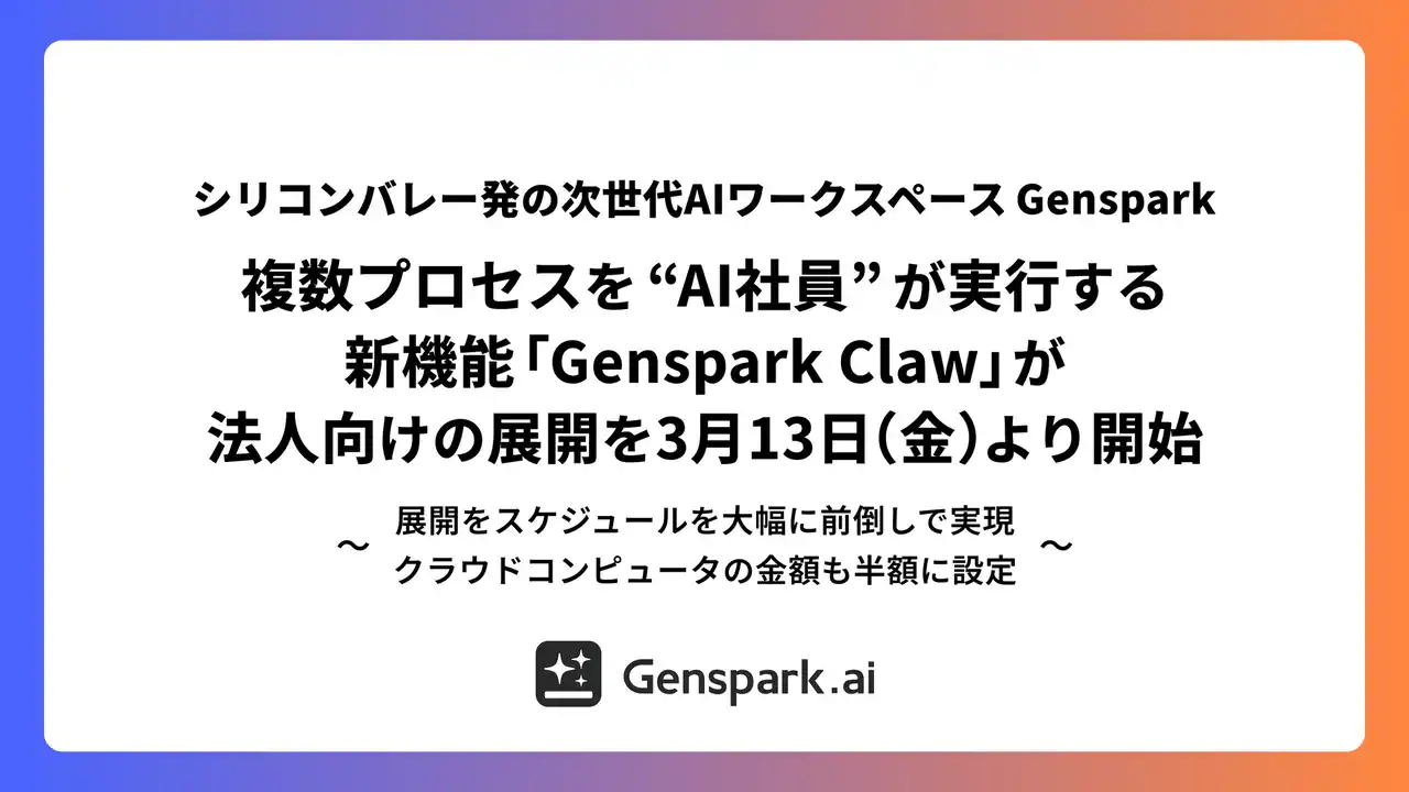 シリコンバレー発の次世代オールインワンAIワークスペース「Genspark(ジェンスパーク)」は、複雑な業務プロセスを “AI社員” が実行する新機能「Genspark Claw(ジェンスパーク・クロー)」について、法人向けの展開を2026年3月13日(金)より開始します。 |