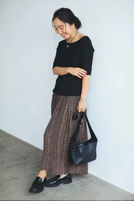 黒トップスには柄スカートを合わせて。インパクトのある柄ボトムに程良いフィット感の五分袖トップスが品と優しいムードを添えてくれます。カッティングが女性らしいので、ローファーやレザーのスクエアバッグでちょっとマニッシュな要素をプラスしてバランスをとりました。 |