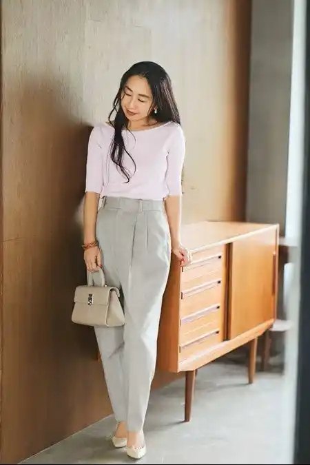 今季、“きれい色”に心惹かれてつくった大人のための優しいピンク。その優しい色みをいかして、全身明るい色のトーンでまとめてみました。ハイウエストのベージュパンツに、靴やバッグもベージュで統一。お仕事にも行けそうなきれいめコーデです。 |