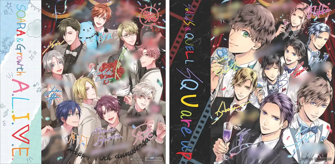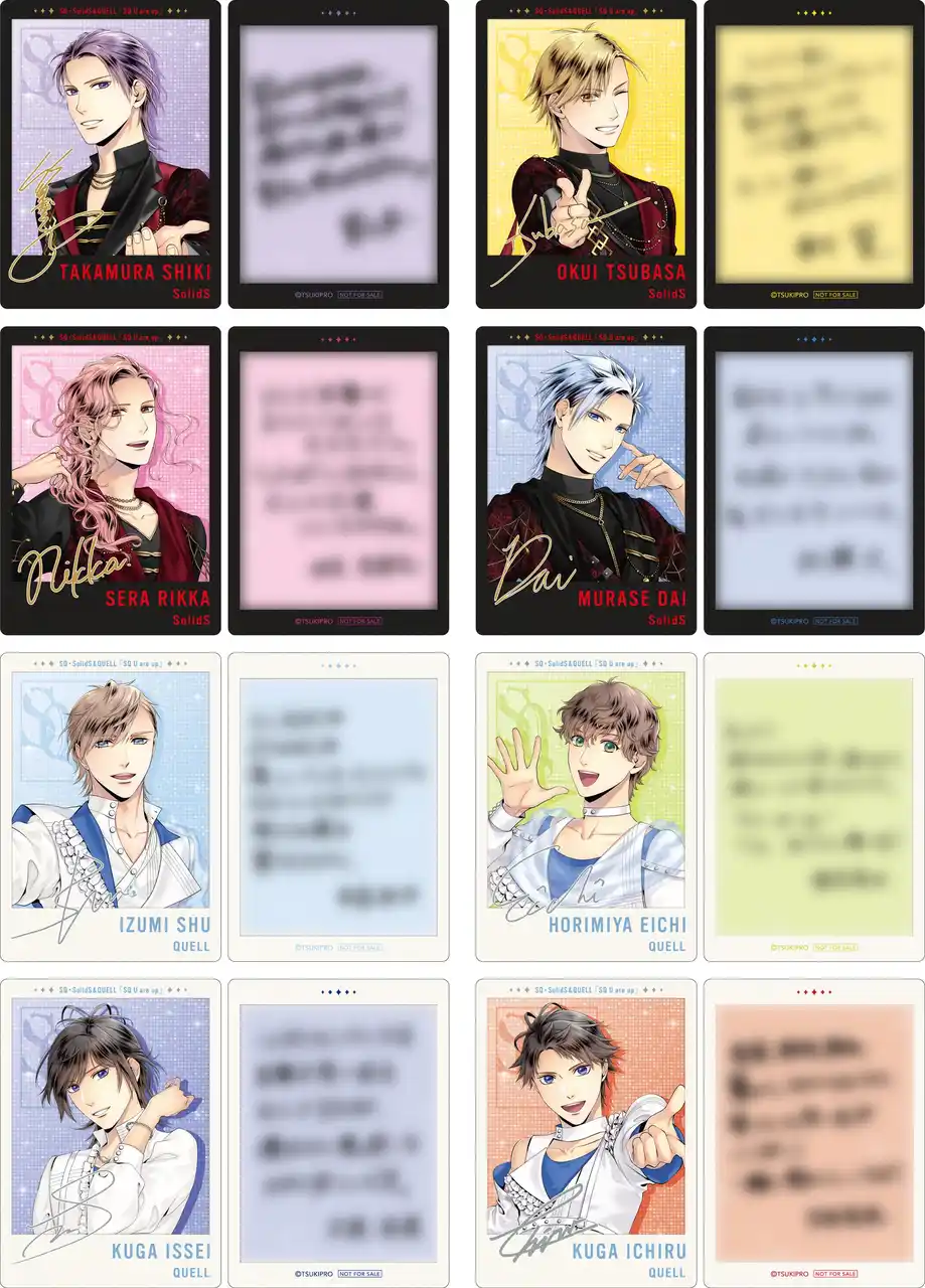 2.5次元に存在する芸能事務所「ツキノ芸能プロダクション(ツキプロ)」に所属するユニット「SolidS」(篁 志季 CV:江口拓也/奥井 翼 CV:斉藤壮馬/世良里津花 CV:花江夏樹/村瀬 大 CV:梅原裕一郎)、「QUELL」(和泉柊羽CV:武内駿輔/堀宮英知CV:西山宏太朗/久我壱星CV:仲村宗悟/久我壱流CV:野上 翔)。 |